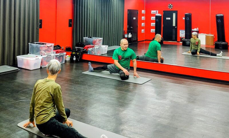 ・股関節と肩のストレッチ方法 ・格闘技の動きを応用したストレッチ ・最後にツボ押し を行いました。